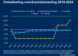Het Nederlandse investeringsklimaat loopt in Europees perspectief uit de pas. Een voorbeeld is de over het algemeen stabiele overdrachtsbelasting. Deze steeg voor woningbeleggers binnen vier jaar van 2% naar 10,4%. Nederland valt hierin qua hoogte en volatiliteit op in vergelijking met haar buurlanden.